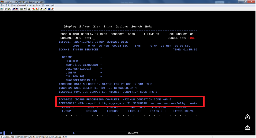 Running job IZUMKFS to create the z/OSMF user file systemThe job IZUMKFS initializes the z/OSMF user file system, which contains configuration settings and persistence information for z/OSMF.