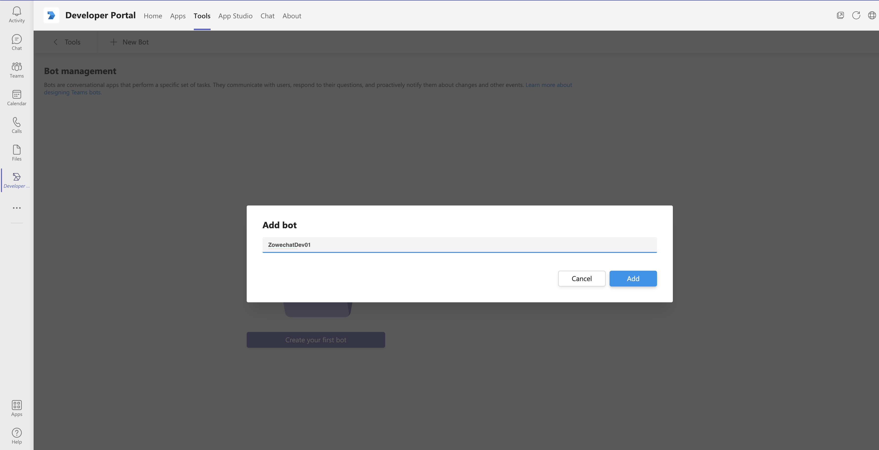 In the prompted dialog, specify a short name for your bot and then click Add.